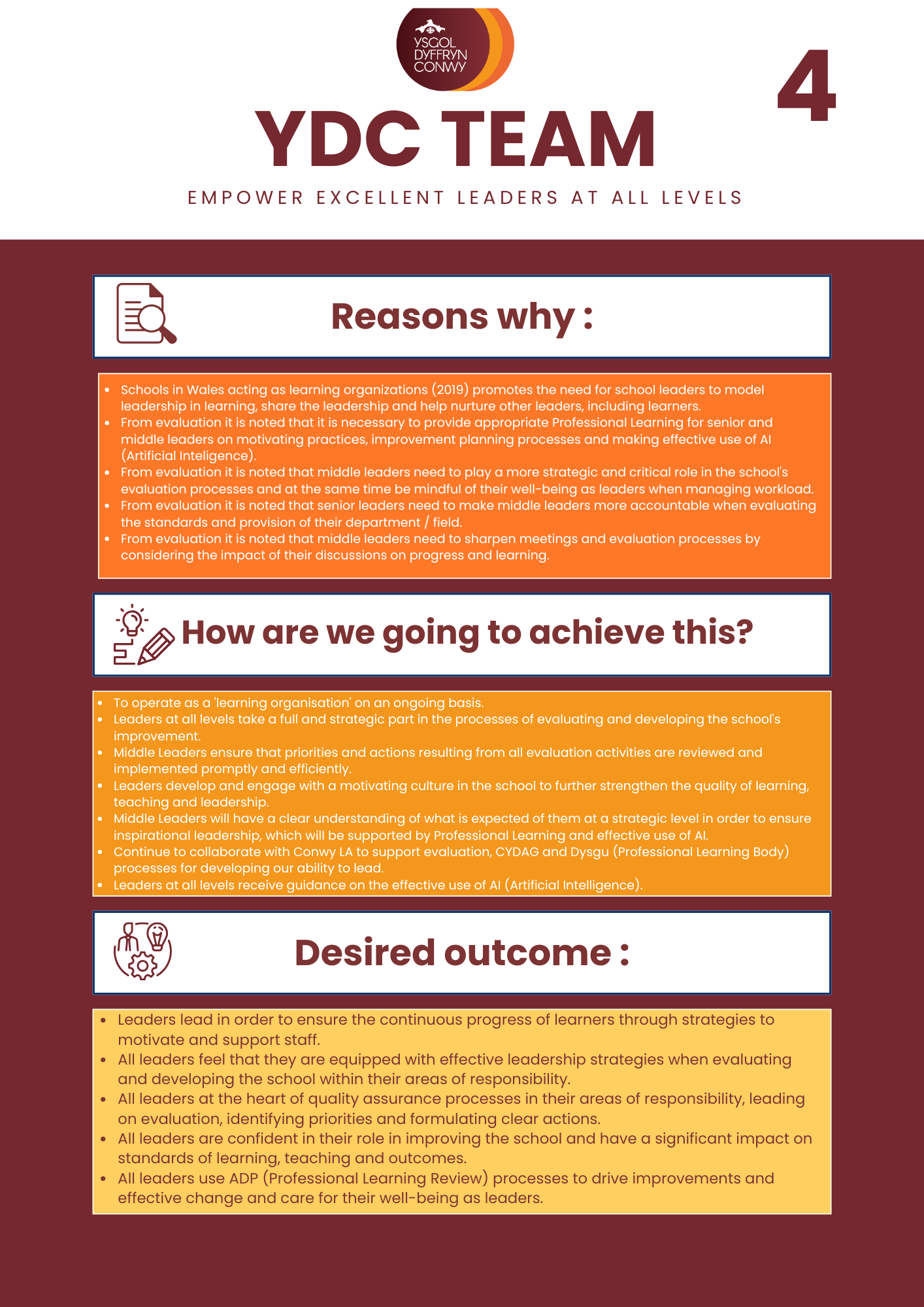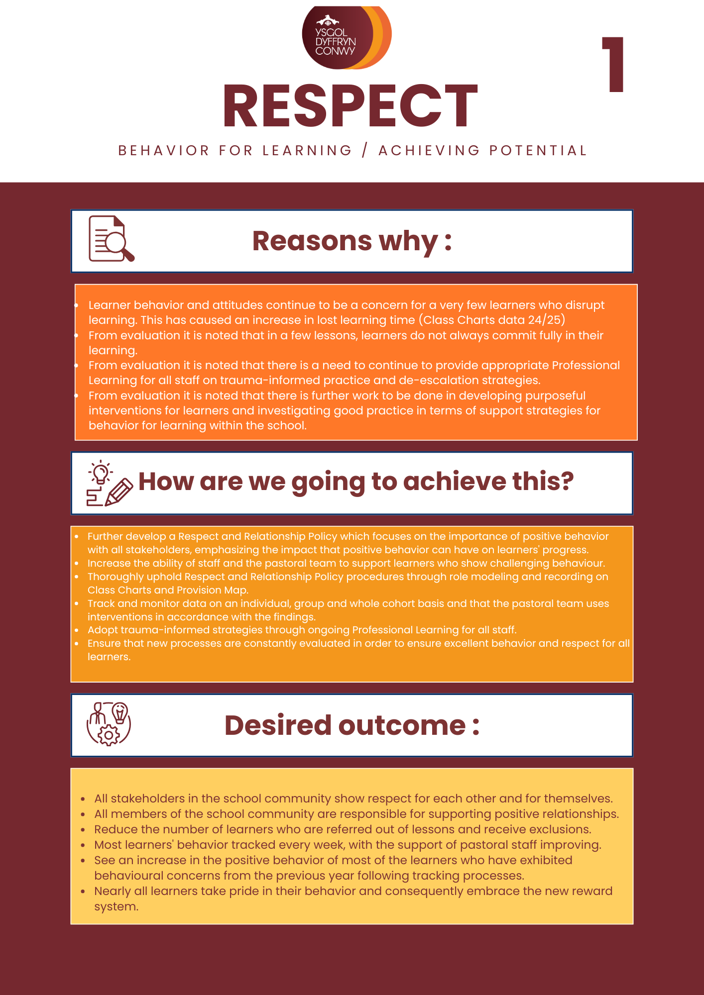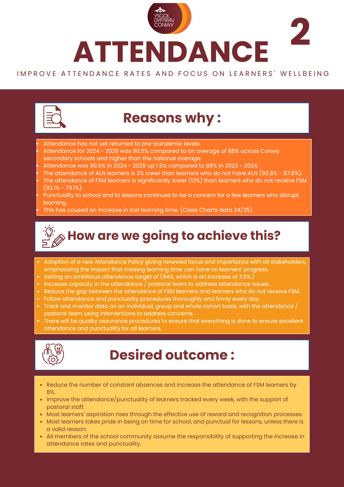 The school plans continually to improve/sustain performance in examinations and external assessments; to respond to local and national priorities; and to continue the professional development of the school in partnership with others. You can read a summary of our current priorities below.