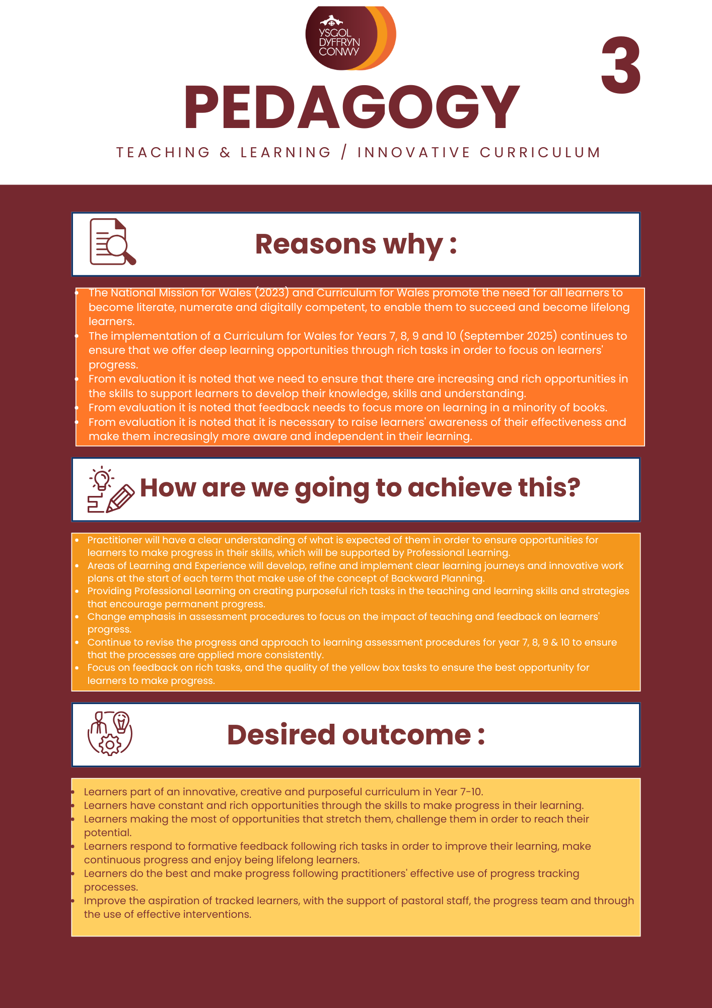 The school plans continually to improve/sustain performance in examinations and external assessments; to respond to local and national priorities; and to continue the professional development of the school in partnership with others. You can read a summary of our current priorities below.